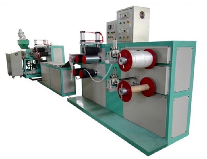 Намотанные катушки отправляют на устройства продольной резки и растяжения нити. Рулон разматывается и распускается на нити нужной ширины тонкими лезвиями. Полученные нити попадают на нагревательную пластину, где вытягиваются до нужной длины.