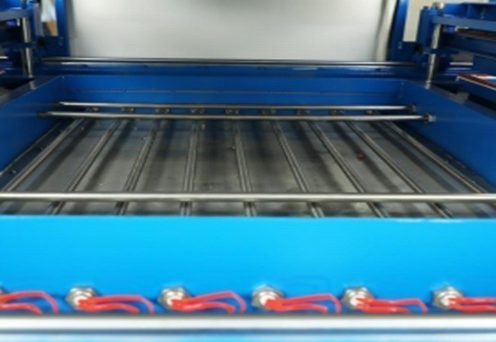 Нагревательная система состоит из керамических инфракрасных излучателей, равномерно распределенных над рабочей зоной. Температурный режим контролируется через систему терморегуляции с возможностью раздельной настройки температуры для каждой зоны нагрева. Формовочные столы изготовлены с системой вакуумных каналов, подключенных к центральной вакуумной системе через регулируемые клапаны. Поверхность столов обработана для обеспечения равномерного распределения вакуума по всей площади формования. Система управления включает панель оператора с цифровым дисплеем для контроля параметров процесса и манометры для мониторинга давления в вакуумной системе.