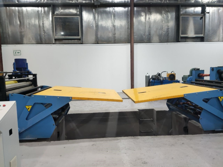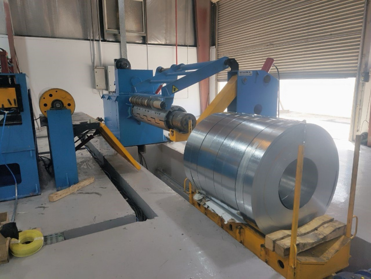 Процесс начинается с загрузочной тележки, которая обеспечивает безопасную транспортировку исходного рулона к разматывателю. Далее консольный разматыватель осуществляет контролируемую размотку металлической ленты, регулируя натяжение для подачи материала в линию без деформаций. Механизм подачи направляет размотанную ленту в устройство выпрямления, где происходит устранение остаточной кривизны и волнистости материала посредством системы выравнивающих валков. После выпрямления лента поступает в ключевой элемент линии – устройство продольной резки, оснащенное дисковыми ножами. Здесь металлическая лента разрезается на полосы требуемой ширины согласно технологическим параметрам. Отрезанные кромки собираются специальным устройством, предотвращающим их попадание в готовую продукцию. Нарезанные полосы синхронно направляются на наматыватель, который формирует рулоны заданного диаметра с равномерной плотностью намотки. Завершает процесс разгрузочная тележка, обеспечивающая безопасное снятие готовых рулонов с наматывателя.